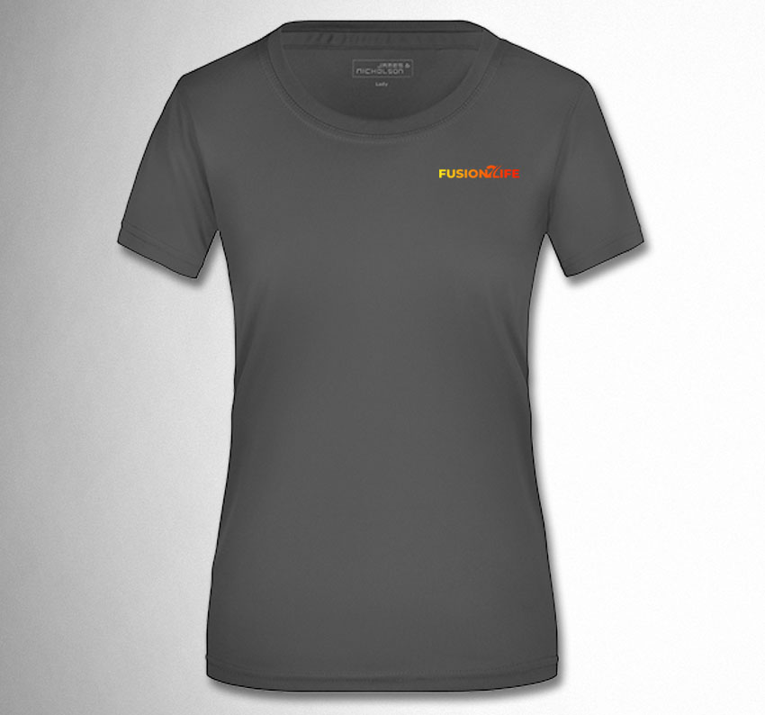 Dieses atmungsaktive Damen T-Shirt (JN357) wird mit dem Fusion2Life Logo auf der Brust sowie einem Spruch auf dem Rücken bedruckt. Einen passenden Spruch könnt ihr auswählen. Zudem habt ihr die Option, auf der rechten Brustseite einen QR-Code zu platzieren. Das Shirt ist speziell für Frauen geschnitten. Das Logo bzw. der Spruch hat eine Breite von ca. 10 cm im Brust- und ca. 30 cm im Rückenbereich.