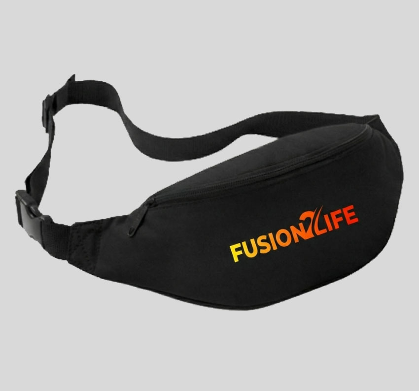 Diese Gürteltasche wird mit dem Fusion2Life Logo auf der Front bedruckt.